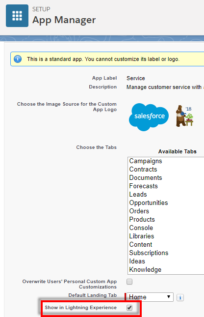 App under App Manager is not visible in Lightning Experience April 13, 2018June 20, 2023Magulan Duraipandian If an App under App Manager is not visible in Lightning Experience, check the following. Edit the app and enable Show in Lightning Experience.