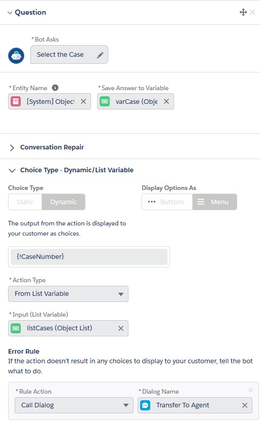 1. Create a Collection variable in Einstein Bot builder. Use [System]Object and make sure to select Contains List.