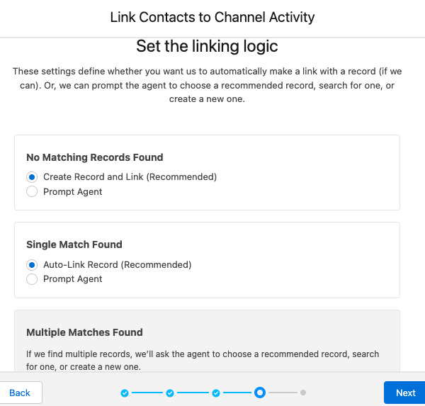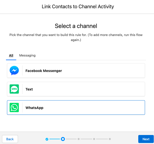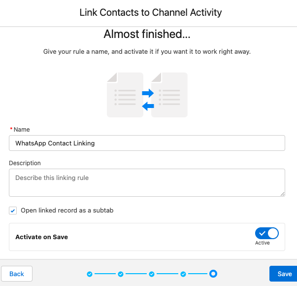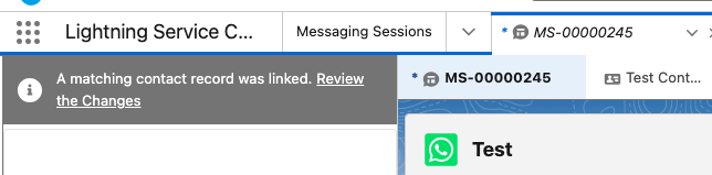 To find matching or create new Contact records for Salesforce WhatsApp Messaging Sessions, make use of Channel-Object Linking.